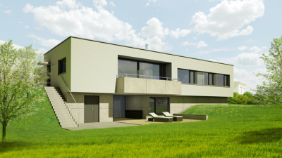 Rodinný dům o dispozici 4+1, je navržen jako jednopodlažní stavba s plochou střechou mírně lichoběžníkového tvaru. Dům je částečně podsklepen. Díky výškovému převýšení pozemku, je část suterénu přístupná ze snížené části zahrady. Stavba je navržena jako kompaktní kubus s podraženým objemem suterénu, který volně přechází v sokl nepodsklepené části objektu. K obytné části objektu je přikloněna hmota dvojgaráže. Na suterén navazuje plocha pobytové terasy s bazénem, která je vymezena svahováním a sadovou výsadbou a tvoří tak soukromý prostor i ochranu proti povětrnostním vlivům.